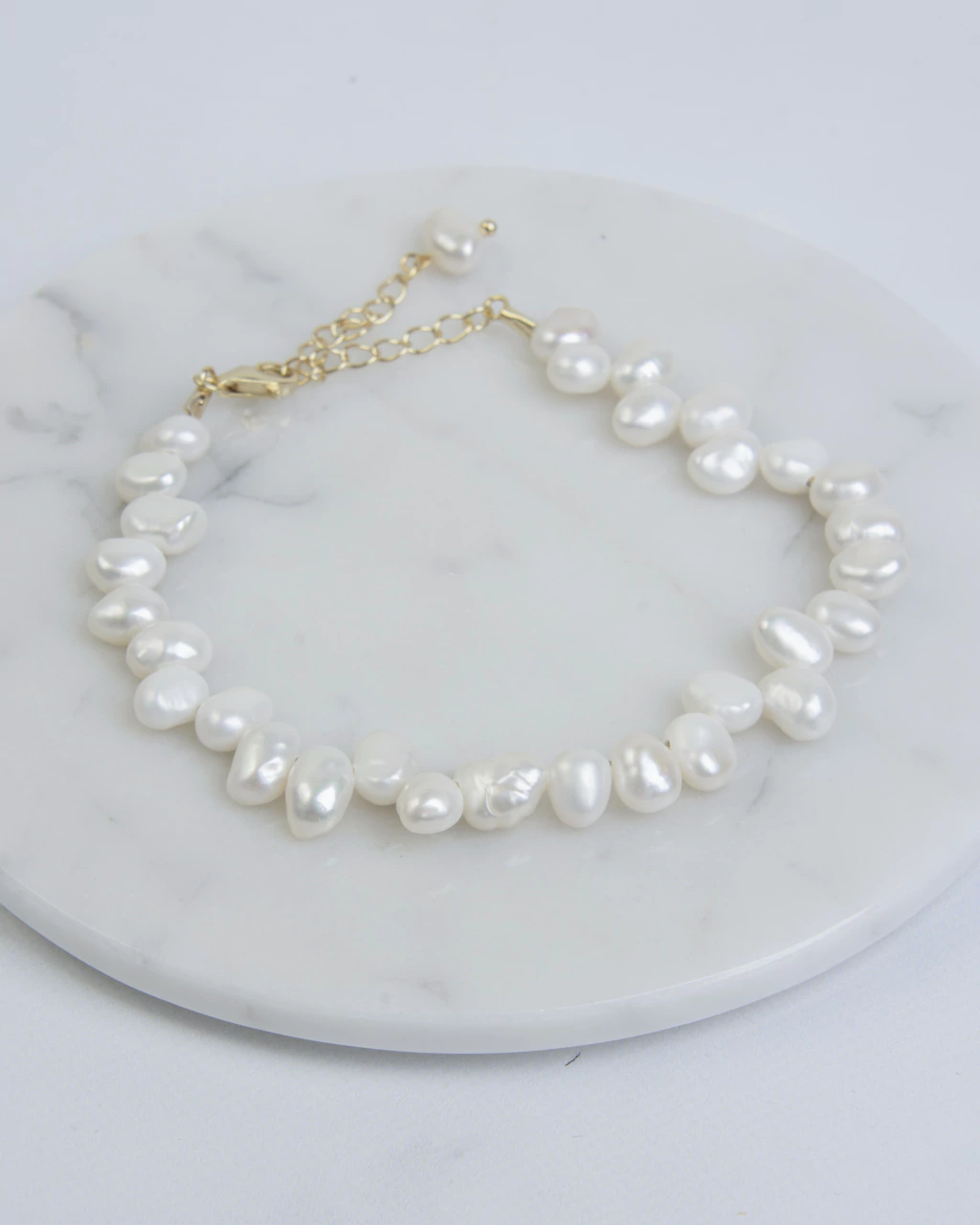 Delicada pero con carácter, Sofía es una pulsera conformada con perlas de río naturales aportando elegancia y personalidad; perlas de diferentes tamaños y formas sobre una cadena de plata Italiana 925 laminada en oro.
